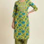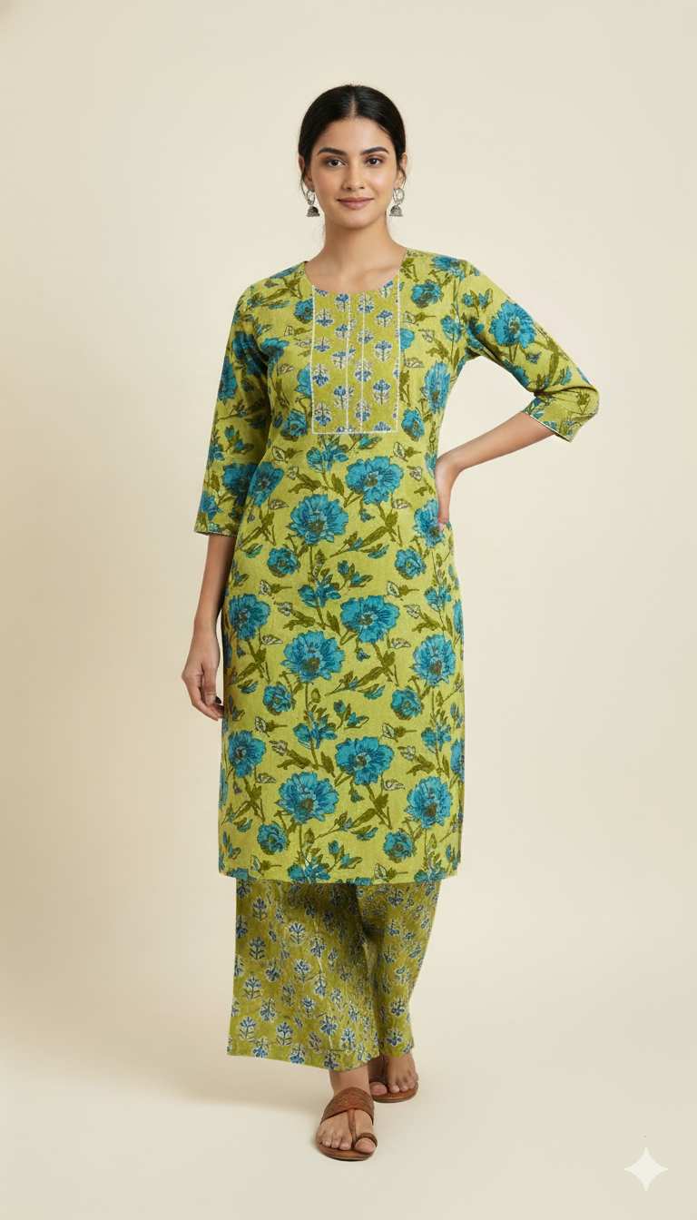 This chic South‑Indian inspired 2‑piece kurti set features a breezy tunic with subtle temple‑border or ethnic