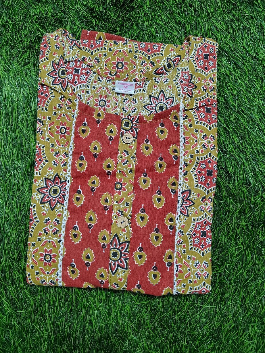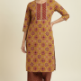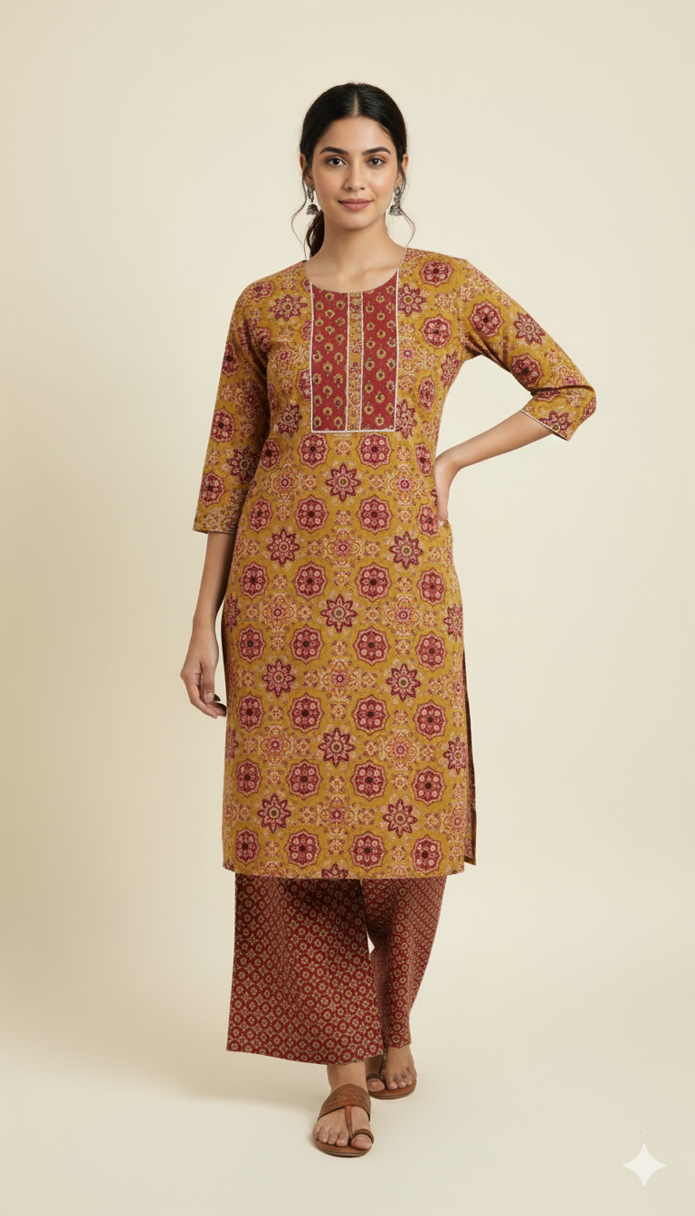 This chic South‑Indian inspired 2‑piece kurti set features a breezy tunic with subtle temple‑border or ethnic