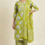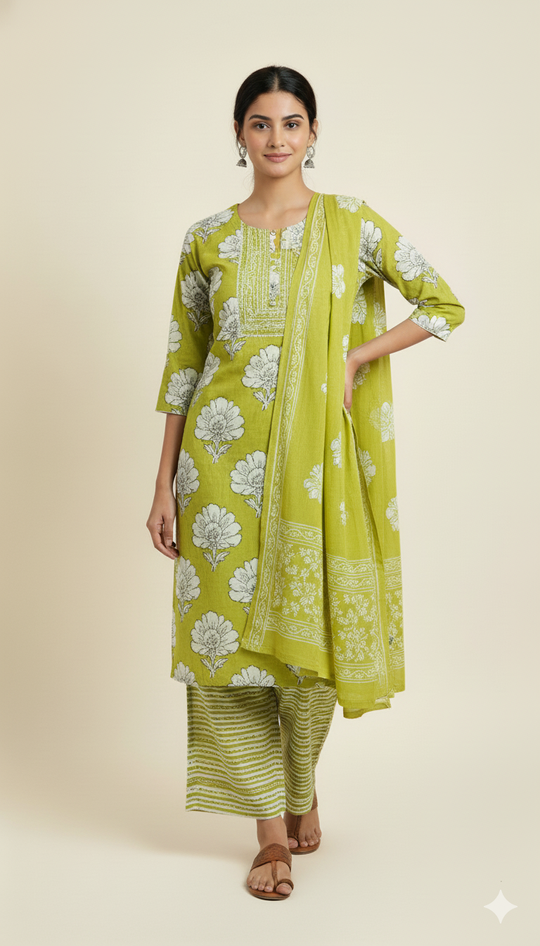 A frock 3-piece set dress in South India typically includes a stylish frock, a matching dupatta (scarf), and coordinating leggings or pants.