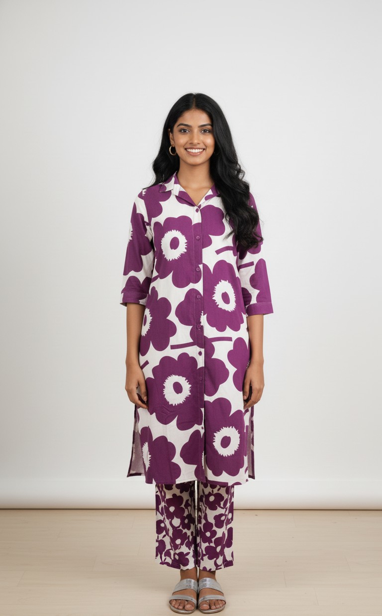 Trendy South Indian co-ord set dress, blending matching patterns with ethnic flair for a stylish, put-together look.