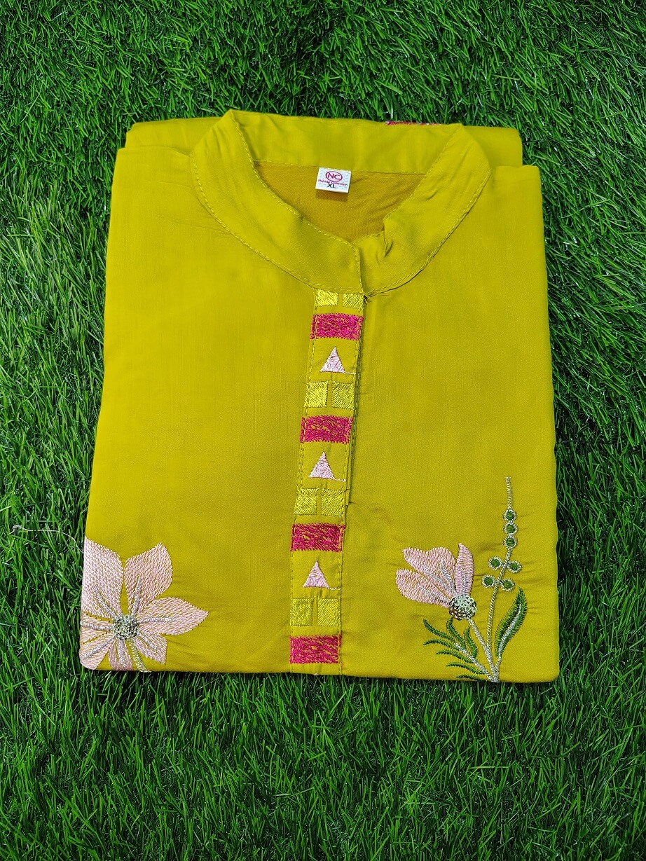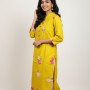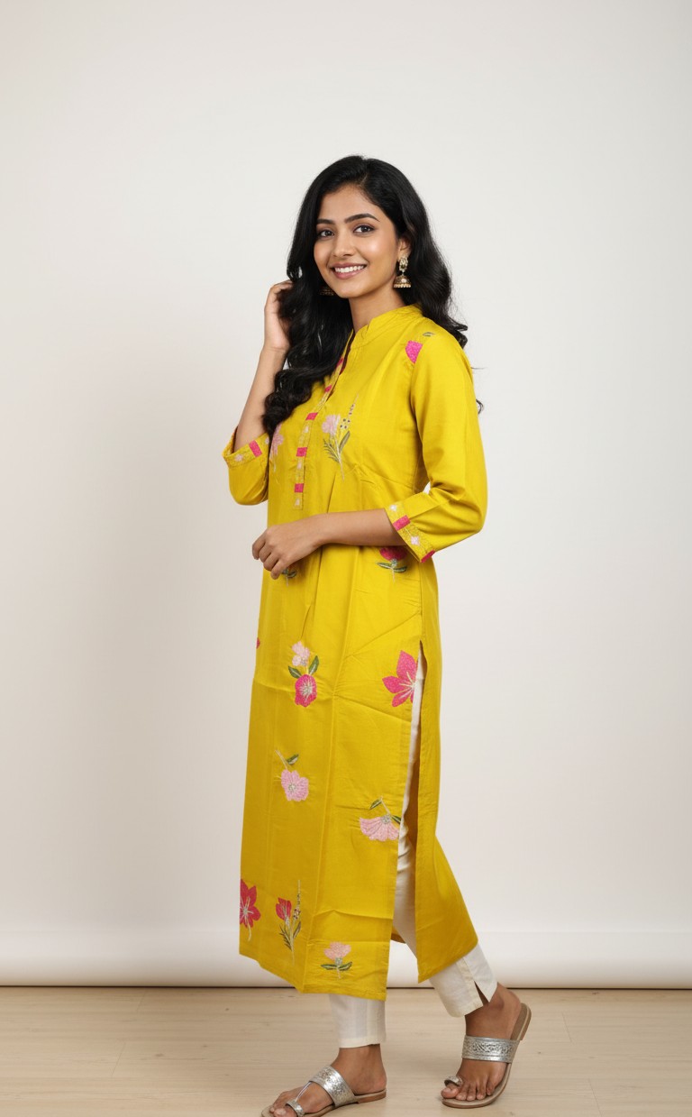 Chic South Indian collared kurthi combining traditional prints with a smart, structured neckline for a modern ethnic look.